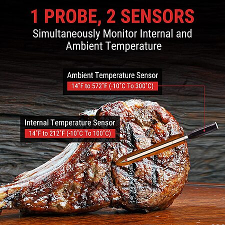 - 1 Probe, 2 Sensors: Bluetooth thermometer for smoker features a meat temperature probe to eliminate the hovering up hassles by giving you consistent internal temp readings even when you're not right next to the meat, along with the ambient pit temperature