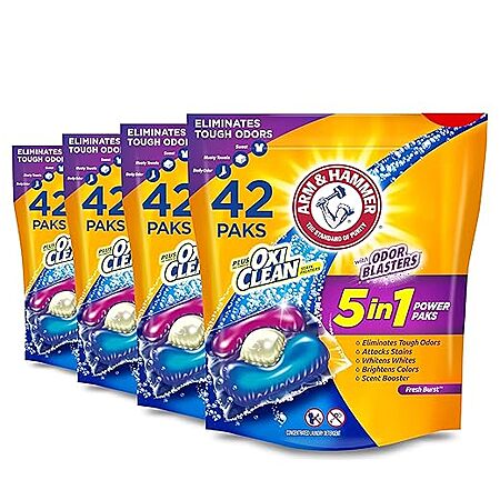 Amazon has for 4-Pack 42-Count Arm & Hammer Plus OxiClean w/ Odor Blasters 5-in-1 Laundry Detergent Power Paks on sale for $32.63 - 5% when you checkout via Subscribe & Save - 25% off when you clip the coupon listed on the product page = $22.84. Shipping is free w/ Prime or on $35+ orders.