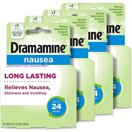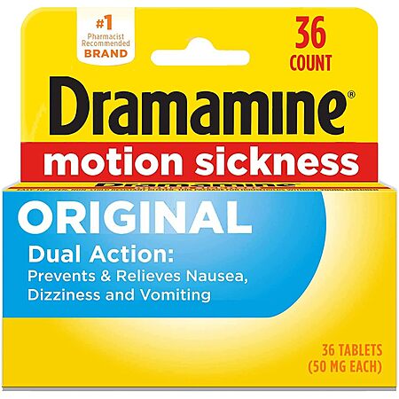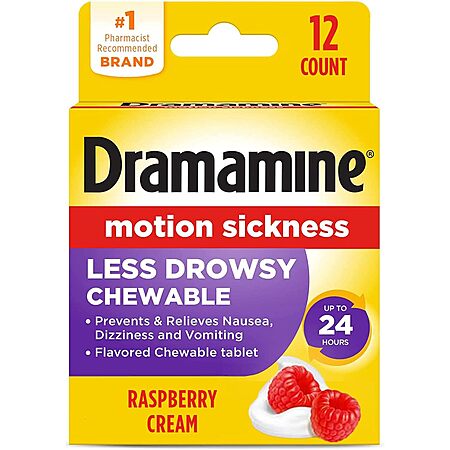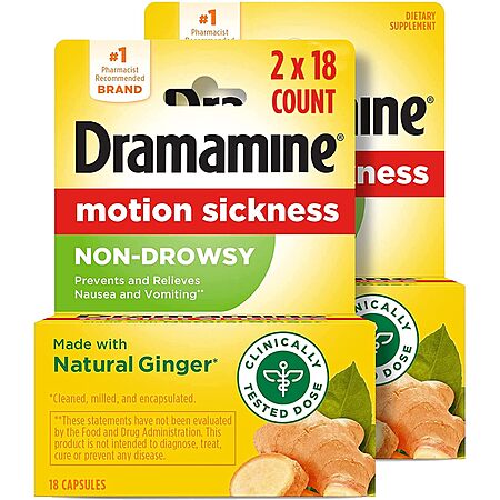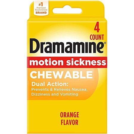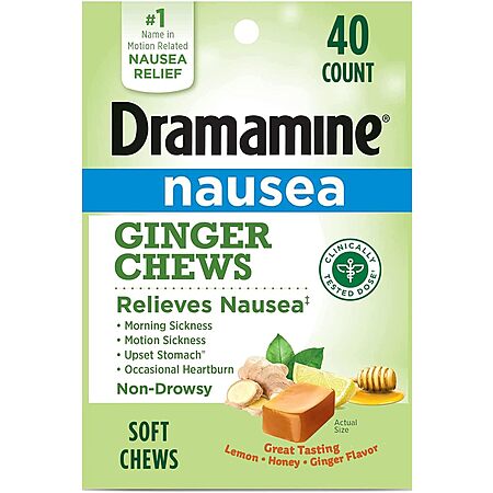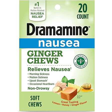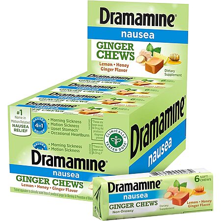 Dramamine: 3-Pack 12-Count Original Motion Sickness Relief $6.95, 20-Count Chewable Nausea Relief (Lemon Honey Ginger) $5.68 & More w/ S&S + FS w/ Prime or on $35+