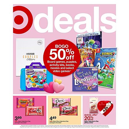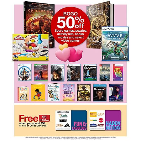 Target is offering Buy One, Get One 50% Off on Select Video Games, Board Games, Kids Books, Puzzles, Movies & Activity Kits. Select free store pickup where stock permits, otherwise shipping is free with RedCard or on orders $35+.