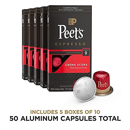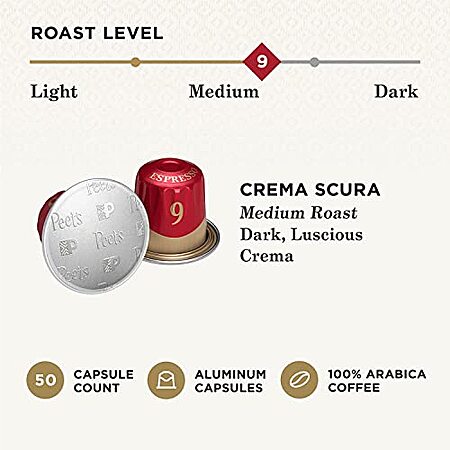 - Contains five (5) Boxes of 10 Peet's Crema Scura Espresso - Intensity 9 Medium Roast Coffee Single Cup Espresso Capsules (50 Espresso Capsules Total)
