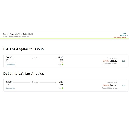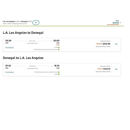 I have a couple of screenshots using the lowest airfares offered on Aer Lingus, along with the promotional code applied for travelling RT Los Angeles to Dublin for $400, nonstop or Los Angeles to Donegal for $541 in basic economy service. This code will work for business class travel.