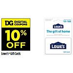 Dollar General in store, 10% off Lowe's gift cards with digital coupon, Feb 4-10