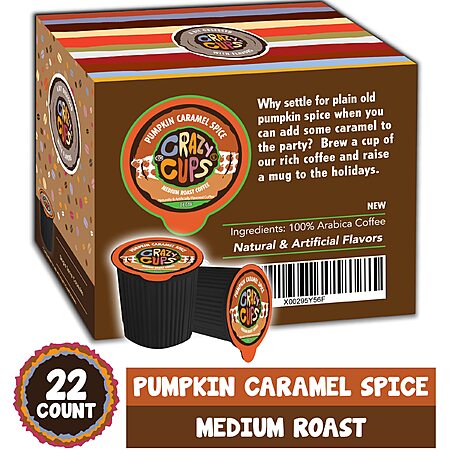Amazon[amazon.com]has 22-Counts Crazy Cups Decaf Single Serve Keurig K Cups (Pumpkin Caramel Spice) for $5.92. Shipping is free w/ Prime or on $35+.