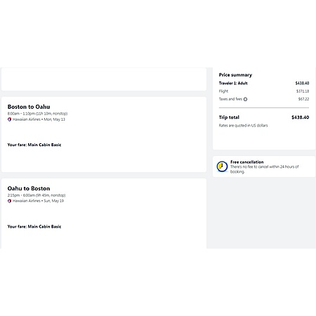 Hawaiian Airlines and Travelocity have round trip airfares travelling to and from Boston (BOS) and Oahu Honolulu Hawaii (HNL) for $439, nonstop. These are basic economy fares where your airfare will include a personal item and a carry-on bag. There is no seat selection and no change. You will be fed on the flight and meals/snack varies.