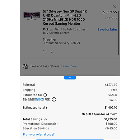 • Visiting the product page on a mobile device via the Shop Samsung app should total $1274.99 + Free Shipping