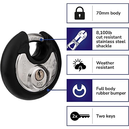 About this Item:- FEATURES: Brink's Stainless Steel Discus Padlock has a 70mm body with stainless steel shackle for cut resistance; Round shielded design minimizes shackle exposure & protects against cutting; Full radius rubber bumper prevents scratches and dings..Note: Measure your door's backset, cross bore and thickness to ensure you find the right fit.