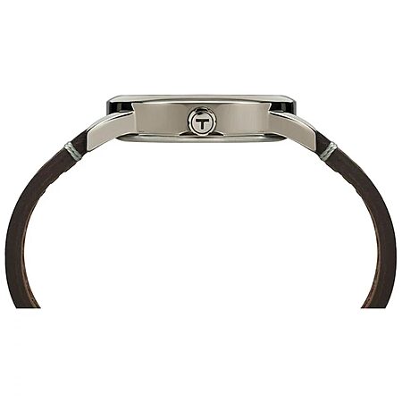 Timex TW2R35800 men's Easy Reader black dial brown strap watch is offered, in a polished solid brass case. This model is made in dimensions of 38mm across and 8mm high. This watch has a fixed bezel and a textured push/pull main crown. Timex TW2R35800 is fitted with a brown genuine leather strap. Securing the strap is a pin buckle clasp made in stainless steel.