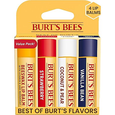 Burt's Bees Beeswax, Strawberry, Coconut and Pear, and Vanilla Bean Lip Balm Pack, With Responsibly Sourced Beeswax, Tint-Free, Natural Lip Treatment, 4 Tubes, 0.15 oz. $6