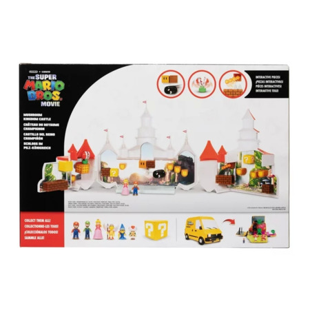 The Mushroom Kingdom Castle is fully enclosed, opens to nearly 22" wide and comes with mini 1.25 inch Mario and Peach action figures. Open the rear of the playset to reveal the training grounds as seen in the movie. With multiple interactive moments, fans can recreate the fun of jumping over recreated piranha plants, jumping over a Bullet Bill, and evading a swinging fire stick.