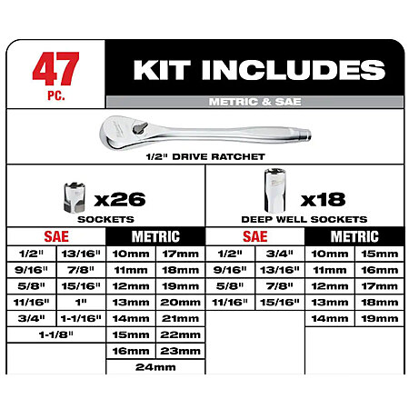 Milwaukee 1/2 in Drive SAE/Metric Ratchet & Socket Set with Packout Case 47-piece $199 Home Depot