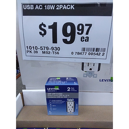 Select Home Depot Stores (link is for reference only) have 2-Pack Leviton 15A Tamper Resistant Type A/C 3.6A 18W USB Outlet (M02-T5638-2BW) for $19.97. In store purchase only.