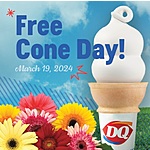 Dairy Queen is holding their annual First Day of Spring freebie by giving away a free small vanilla cone on Tuesday, March 19, 2024! This day is even sweeter if you're a DQ Rewards member — you'll get double points on any food purchase that day, too. And the fun doesn't stop there: you can keep earning points year-round to redeem for exciting eats and tasty treats. Free small vanilla cone at participating U.S. non-mall locations. All day, limit one per person. While supplies last. Not valid on delivery or mobile orders.