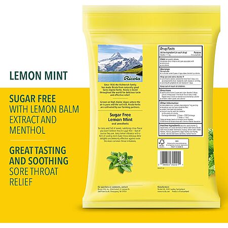 About this Item:- RICOLA SUGAR-FREE LEMON MINT THROAT DROPS: Ricola Lemon Mint Throat Drops combine refreshing lemon and mint with soothing menthol, flavored by Ricola's delicious blend of Swiss alpine herbs. A sugar-free lozenge that is soothing, effective, & pleasant. Active Ingredient (in each drop): Menthol, 1.5 mg (Also available with sugar in our variety pack.)