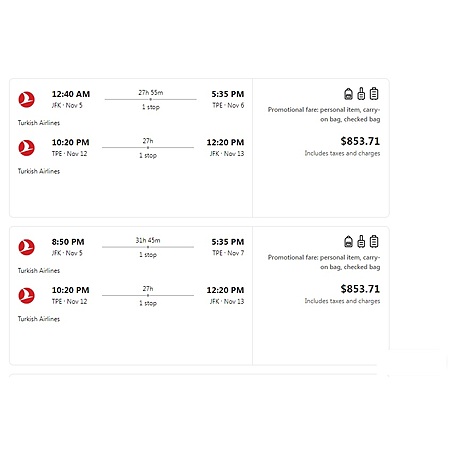 RT New York to Taipei Taiwan $854 Airfares on Turkish Airlines BE with 1 Free Checked Bag (Travel November - January 2025)