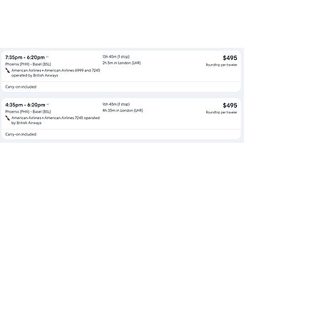 American Airlines and British Airways have round trip airfares travelling from Phoenix (PHX) to Basel Switzerland (BSL) for $495, making 1 stop. These are basic economy fares that will allow a personal item and a carry-on bag. There is no seat selection and no change. You may purchase additional services (such as a checked bag, seat selection, etc..) as you check out.