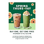 Celebrate Spring ThursYay with a BOGO. Buy a handcrafted drink and get one free from 12–6 PM on Thursday, 3/14. Try your luck on something new, like our Luck of the Matcha Crème Frappuccino® Drink, available for a limited time only.