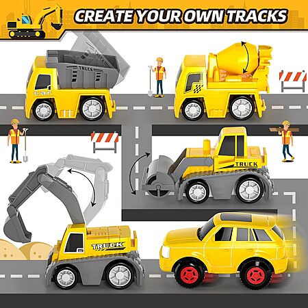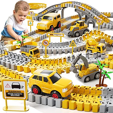 What's Include - Our construction toys includes 200 PCS flexible track components, 2 race cars, 4 mini construction truck, 8 traffic signs, 2 trees, and a bridge. Advanced configuration for your little kids to build their own construction kingdom!