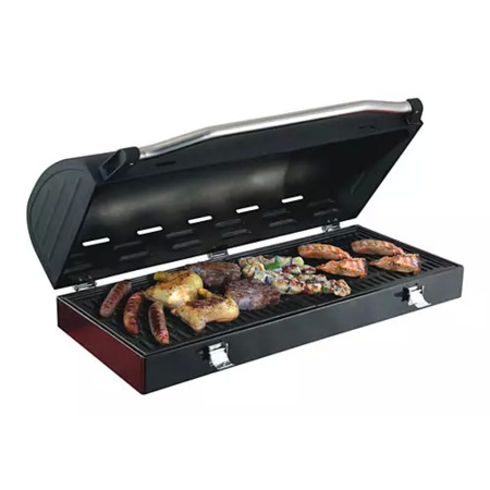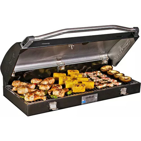The Camp Chef ® Professional Double Grill Box turns your outdoor stove into a powerful barbecue grill. This grill displays a massive size and features a patented diffuser plate that captures and vaporizes grease allowing you not to worry about hot spots and providing your food with a rich BBQ flavor. The Double Grill Box features two removable cast iron grates, a hinged lid to seal in the flavor and a built-in thermometer.