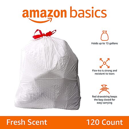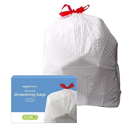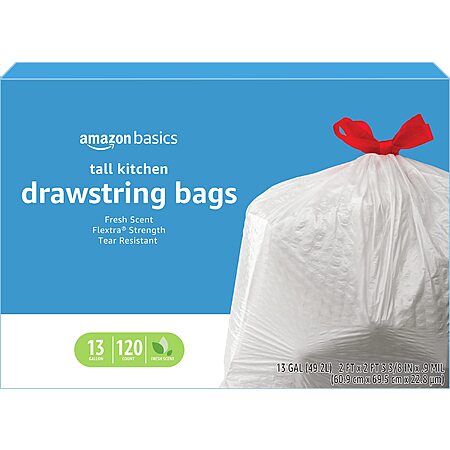 120-Count 13 Gallon Amazon Basics Flextra Tall Kitchen Drawstring Trash Bags