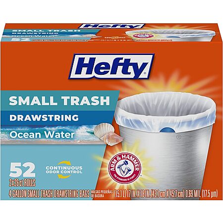 Amazon has 52-Count 4-Gallon Hefty Small Trash Bags (Ocean Water Scent) on sale for $7.49 - $1.87 when you clip the coupon on the product page - 5% when you check out via Subscribe & Save = $5.25Shipping is free with Prime or $35+ orders.