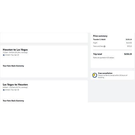 United Airlines have round trip airfares travelling to and from Houston (IAH) and Las Vegas (LAS) for $159, nonstop. These are basic economy fares that will only allow a personal item that fits under the seat in front of you. There is no seat selection, no carry-on bag and no change. If you are travelling with children, you will be seated together as per UA's policy.
