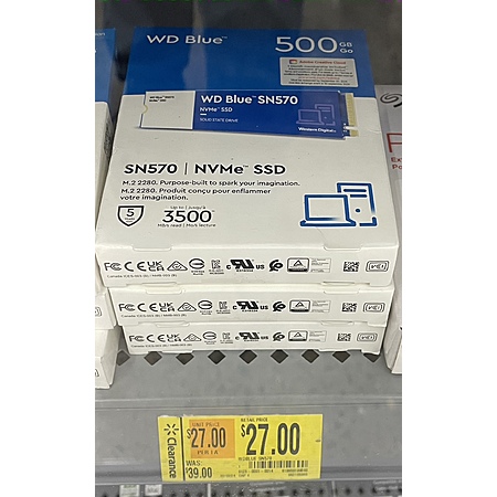 Select Walmart Stores (link is for reference only) have 500GB Western Digital WD Blue SN570 NVMe Gen3 x4 PCIe Internal Solid State Drive for $27. In store purchase only.