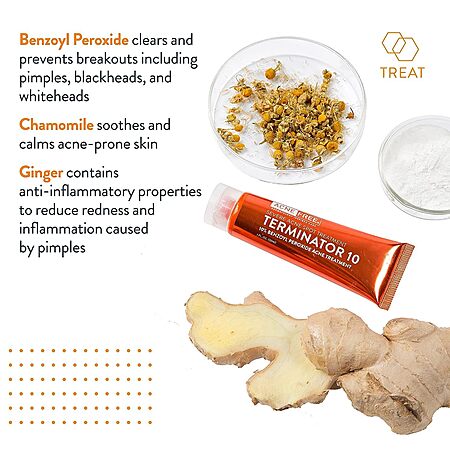 * Treat + Care for your skin with the concentrated 10 percent Benzoyl Peroxide, a medicated acne topical spot remover that treats acne breakouts, and chamomile and ginger to soothe and calm acne prone skin