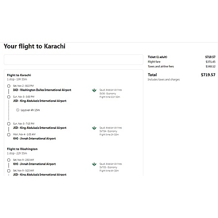 RT Washington DC to Karachi Pakistan $720 Airfares on Saudia Airlines with 2 Free Checked Bags (Travel October - November 2024)