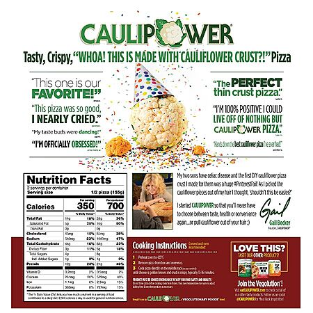 Cauliflower is the main ingredient of the crust followed by rice flour. 1/2 pizza (155g) Calories 350. Carbs 44 g, Sodium 540 mg, Fat 14g incl 5g saturated from one or more: Canola oil, Sunflower oil, olive oil
