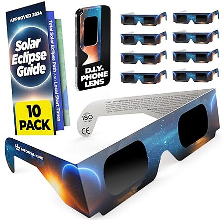 Model: Medical king Solar Eclipse Glasses Approved 2024, (10 pack) CE and ISO Certified Safe Shades for Direct Sun Viewing Includes Bonus Eclipse Guide With Map