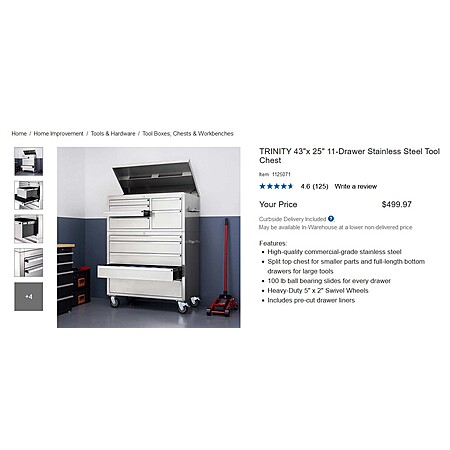 Costco Wholesale has for its Members: Trinity 43"x 25" 11-Drawer Stainless Steel Tool Chest (TLS-0408) on sale for $499.97. Curbside delivery is free.