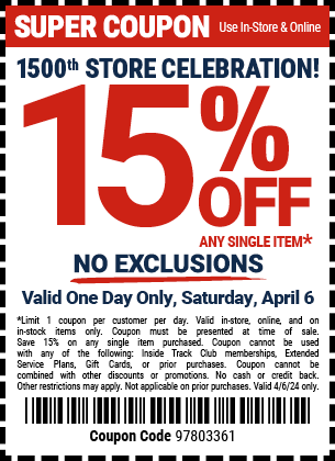 Harbor Freight [Store Locator] is offering their Harbor Freight Online/In-Store Coupon: 15% Off Any Single Item (No Exclusions) when you redeem for online or in-store purchase.