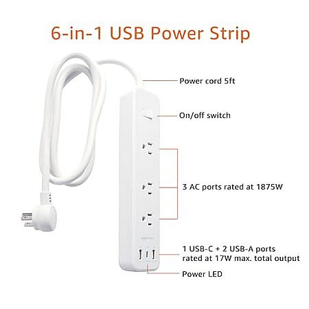 Model: Amazon Basics Rectangle Power Strip 3 Outlet 3 USB Ports, 1 USB-C and 2 USB-A, 5 ft Extension Cord, for Home, Office, Travel, White