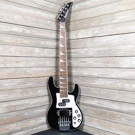 It's a weird mutt of influences that somehow works. The pickguard, bridge, and pickup cover say Ric, but it's got a P-shaped body with belly cut and arm bevel, PJ pickups, active 9V preamp with 3-band EQ, and a pointy Jackson headstock.