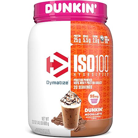 Amazon has 1.45-Lbs. Dymatize ISO100 Hydrolyzed 100% Whey Isolate Protein Powder (Dunkin' Mocha Latte Flavor) on sale for $16.74 - 5% Subscribe & Save = $15.90. Shipping is free w/ Prime or on $35+ orders.