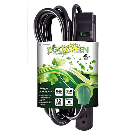 $6.13: GoGreen Power (GG-16103M-12BK) 6 Outlet Surge Protector, 250 Joules, Black, 12ft Cord