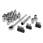 Set includes (1) 1/4 in. drive pass-through ratchet, (1) 3 in. pass through extension bar, (17) 1/4 in. drive pass-through sockets: SAE-5/32, 3/16, 7/32, 1/4, 9/32, 5/16, 3/8, 7/16, 1/2 in. and metric - 4, 5, 6, 7, 8, 9, 10, 11 mm (1) bit adapter socket, (10) screwdriver bits