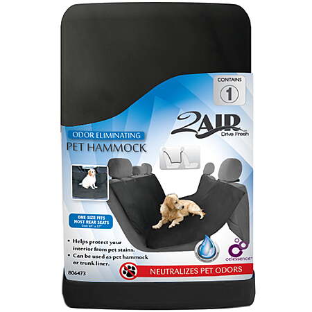 The 2Air Odor Eliminating Black Rear Bench Pet Hammock Seat Protector keeps your vehicle looking and smelling great. The bench seat protector is 69" x 57" to provide one size fitment for most rear seats with or without headrests. The Pet Hammock Seat Protector incorporates a sturdy set of straps on the corners to make fitment on most vehicles simple and easy. The bench seat protector is ideal for pet owners. Helps to keep hair, mud and dirt off your seats, but also provides an added layer of comfort for Fido while you're out and about. The protector can also be utilized as a convenient trunk liner. The protector neutralizes pet odors that is long lasting, safe on the skin and non-leaching. The protector is made from heavy duty polyester and wipes down easily for extra convenience.