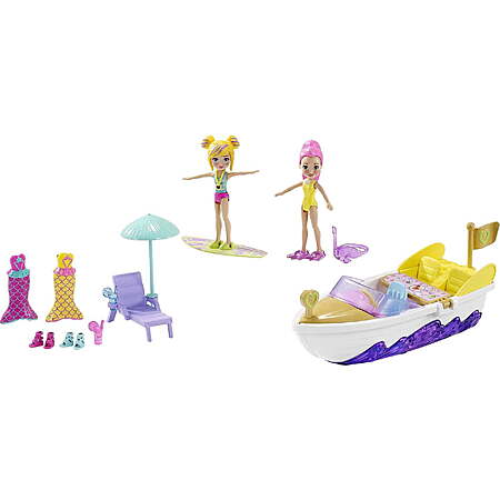 Per product page: Playset features water-themed activities, 3-inch Polly and Margot dolls, 2 mermaid outfits, a surfboard, snorkel and mask, fins, locket, 2 pairs of shoes, a submarine (attached), boat and more. Kids' can fill the aquarium area with water and use the diving board to activate and move water in the tank.