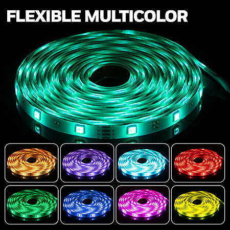 Light up your room with a 16.4' flexible multi-color RGB strip light. Use the included 44 key remote control choose from 20 preset LED colors and 10 lighting effect modes. Activated the sound-sync feature and these lights with dance, flash and change colors in-sync with your music. The extra long strip light allows you to cover a 16.4 foot area, or cut the strip to your desired length and easily mount on any surface with the self-adhesive back. Using the included power adapter, plug the strip light into any standard wall outlet for simple plug-and-play installation. The strip light can be installed indoors or outdoors with its weatherproof protection coating. With multiple dimmer and timer settings you have full control over your lighting experience.