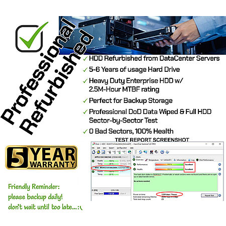 Item Description from the Seller:- "These HDD is used by Datacenter Servers for about 5 Years Period. HDD was refurbished and data wiped with DoD Standard. It's fully tested & passed HGST factory disgnose software test with ZERO Bad Sectors! Since this is a heavy duty enterprise HDD with 2.5M-hour MTBF rating. We are confidence that to honor another 5 Years Warranty from these hard drives"
