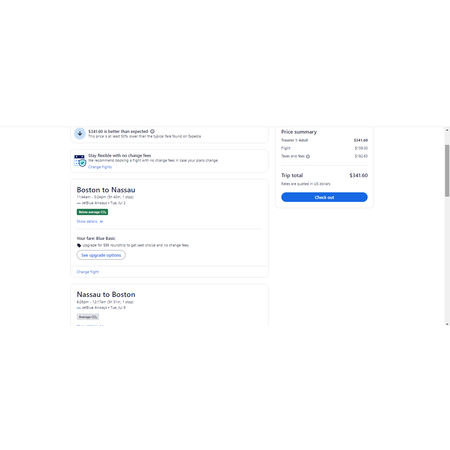 JetBlue have round trip airfares travelling from Boston (BOS) to Nassau Bahamas (NAS) for $342, making 1 stop. These are basic economy fares that only include a personal item. There is no seat selection, no carry-on bag and no change. If you are travelling with children, you will be seated together as per JetBlue's policy.