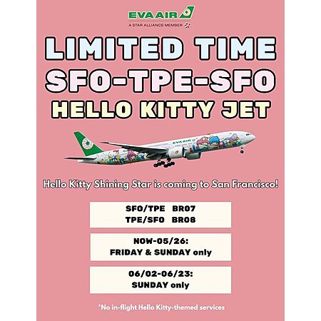 Airfares are not the lowest by all means but if this is on a bucket list, like it is on mine....EVA Airways have limited-time Hello Kitty flight, 'Shining Star'! Experience round trip from San Francisco to Taipei, available exclusively from now to June 23, 2024.