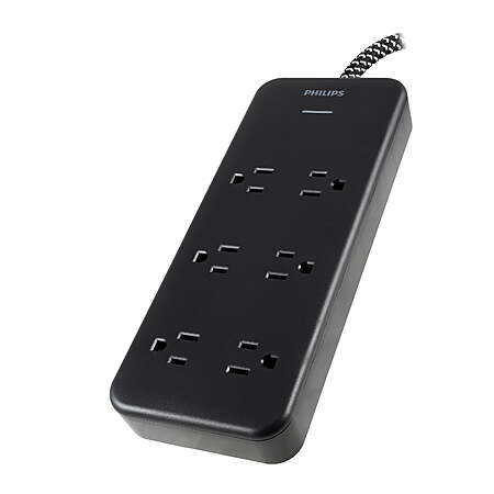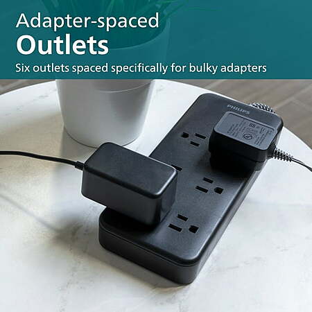 Maximize your power with the Philips Adapt 6-Outlet Adapter-Spaced Surge Protector. This essential surge protector converts one three-prong outlet to six grounded outlets that are spaced specifically for bulky adapters for laptops power cords and more. It is equipped with an integrated circuit breaker that protects your electronics if the capacity is exceeded by a power surge and automatic shutdown technology to cut power if the components expire. Featuring a surge protection rating of 1 080 Joules and a protected indicator light to show when surge protection is active rest assured your electronics are safeguarded from voltage spikes. This product is both safe and stylish; the sleek black design perfectly blends into any space. Easily power and protect your devices from a distance with the braided extra-long 8ft. cord. The stylish woven fabric of the cord prevents bends or tangles extending the lifetime and durability of your cord. For use in grounded outlets only this high-quality surge protector is ETL Listed and backed by a limited-lifetime no-hassle replacement plan as well as a $100 000 Connected Equipment Warranty for added peace of mind. Protect your essential devices confidently with the Philips Adapt 6-Outlet Adapter-Spaced Surge Protector.