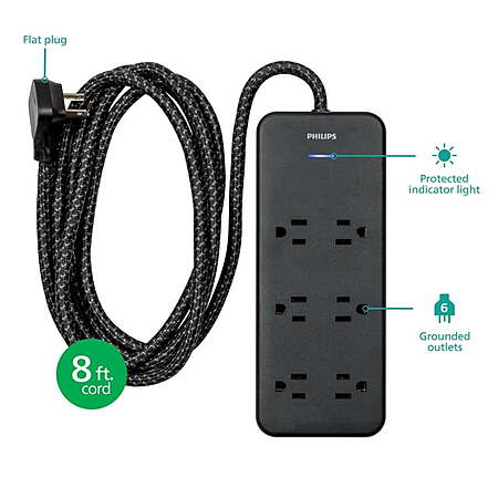 Model: Philips Accessories EZFit 6-Outlet Surge Protector Power Strip, 8 Ft Braided Extension Cord, Widely Spaced Outlets, 1080 Joules, Flat Plug, for Home Office Dorm Essentials, Black, SPC6066BB/37