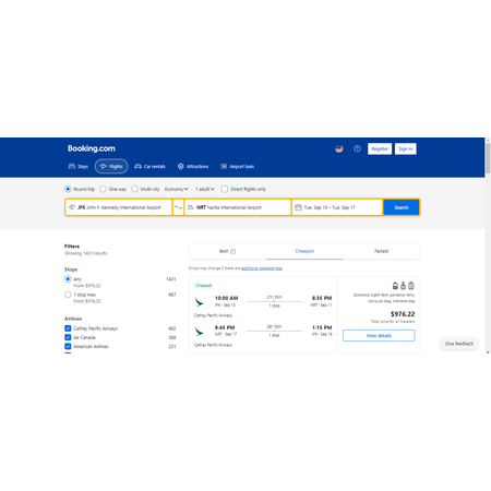 Cathay Pacific via Booking.com have round trip airfares travelling from New York (JFK) to Tokyo Japan (NRT) for $977, making 1 stop in Hong Kong both ways. These are economy light fares that will allow you to have a personal item, a carry-on bag and a free checked bag.