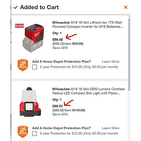 Store still had both items in stock near me. I may just keep the light and inverter at 40% off. Also Discover card gives 5% cash back on Home Improvement purchases this quarter! Thanks OP.