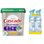 Amazon has 62-Ct Cascade Platinum Dishwasher Pods (Lemon) + 2-Count 8.8-Oz Febreze Air Freshener Sprays (Linen & Sky) on sale for $16.15 when you follow the instructions below. Shipping is free w/ Prime or on $35+ orders.