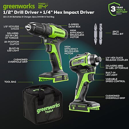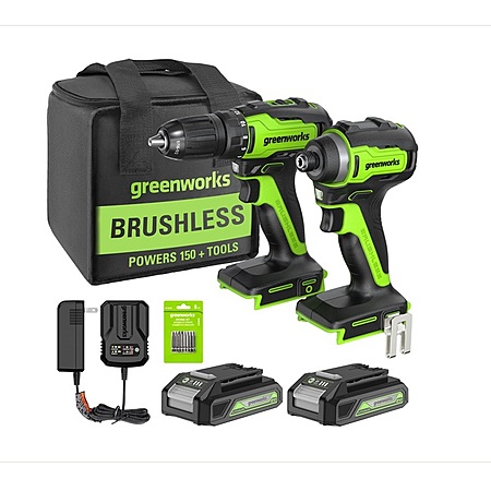 24V Brushless 1/2” Drill / Driver, 1/4” Hex Impact Driver, 8 pcs Bit Set & Bag Kit w/ (2) 2Ah Batteries & Charger $99.99
